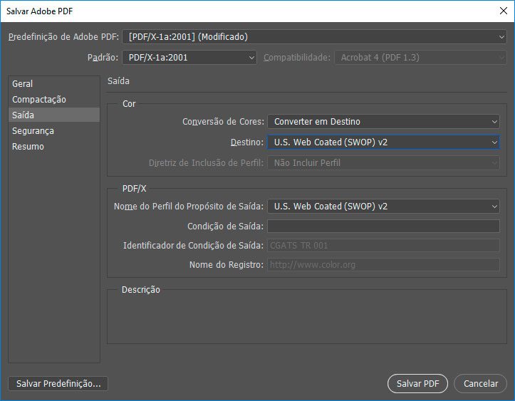 Tenha certeza de que na aba Saída a opção Destino esteja como U.S. Web Coated (SWOP) v2 e em seguida clique em Salvar PDF.